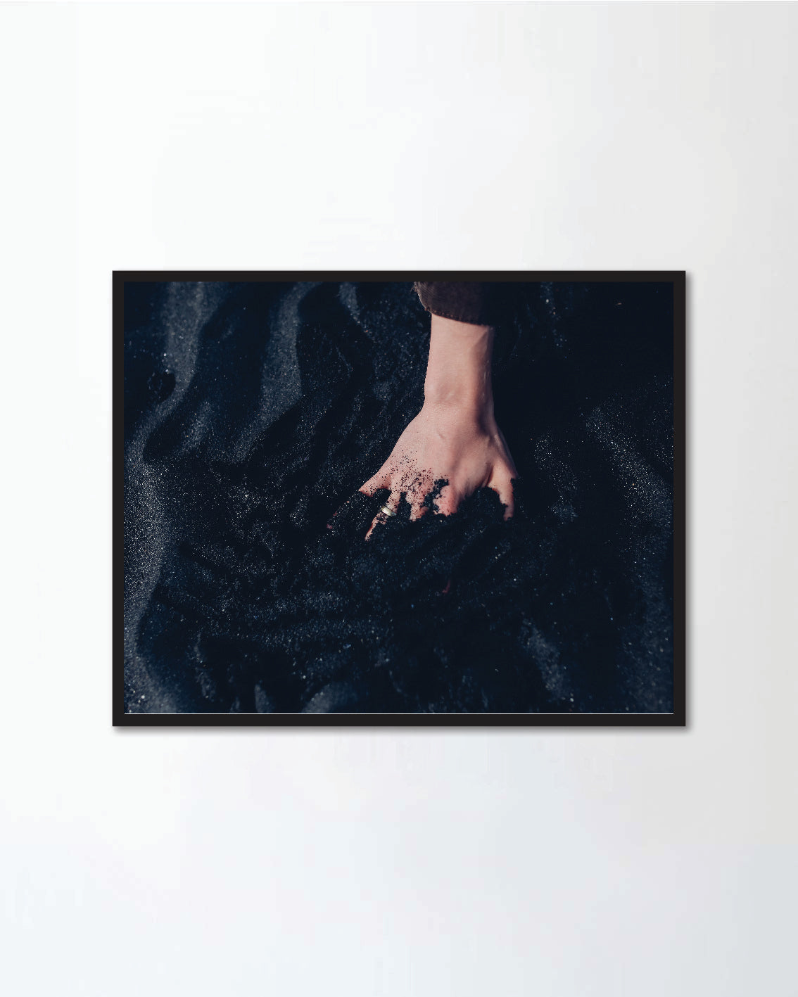 Hand with the ring in the black sand